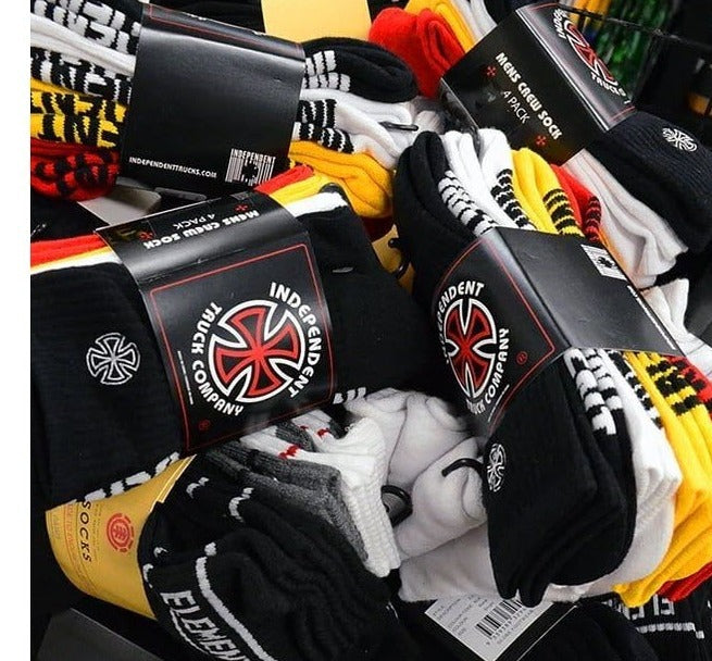 Skate socks do more than cover your feet—they absorb impact, prevent rub, and stay up without bunching. From basic crews to limited graphics, socks are part of the uniform.