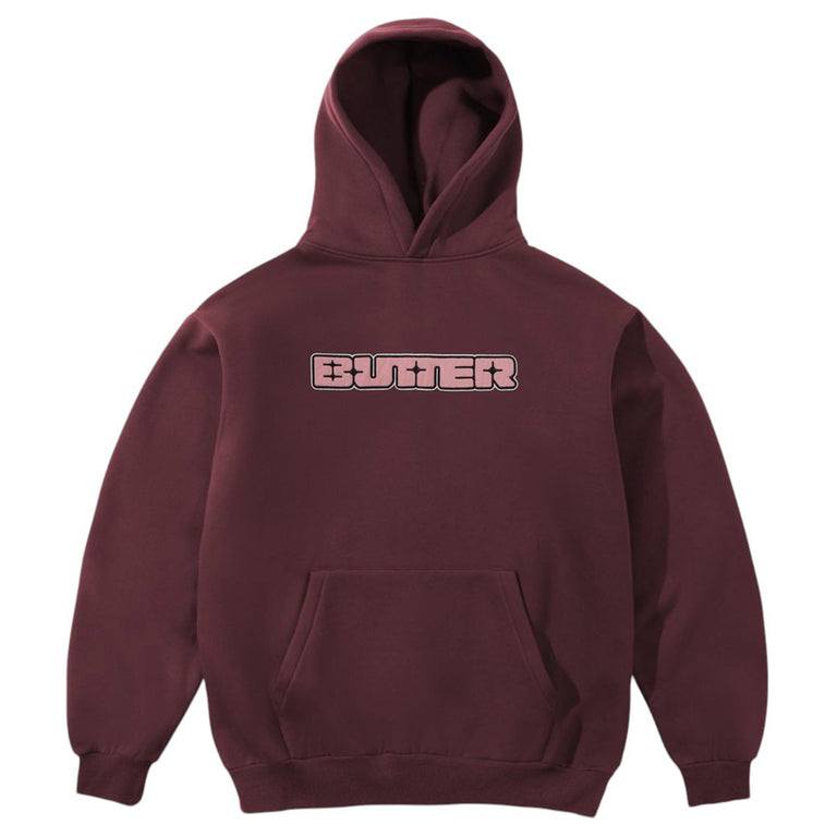 The Butter Goods Glint Nylon Applique Hoodie in Burgundy brings solid fleece weight with textured front branding.