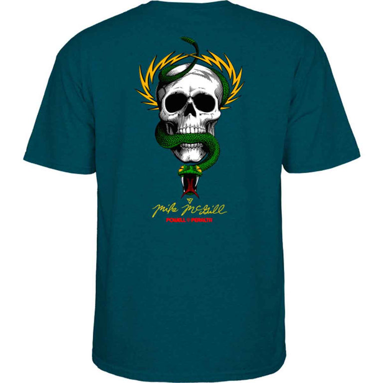 Powell Peralta McGill Skull & Snake Tee Midnight Teal features VCJ’s legendary 1984 Skull & Snake artwork for Mike McGill.