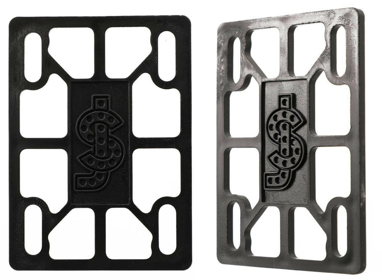The Shake Junt SJ 1/8" Riser Pads in black come in a set of two. These riser pads help reduce wheel bite and absorb shock, making them a practical addition to your skateboard setup.